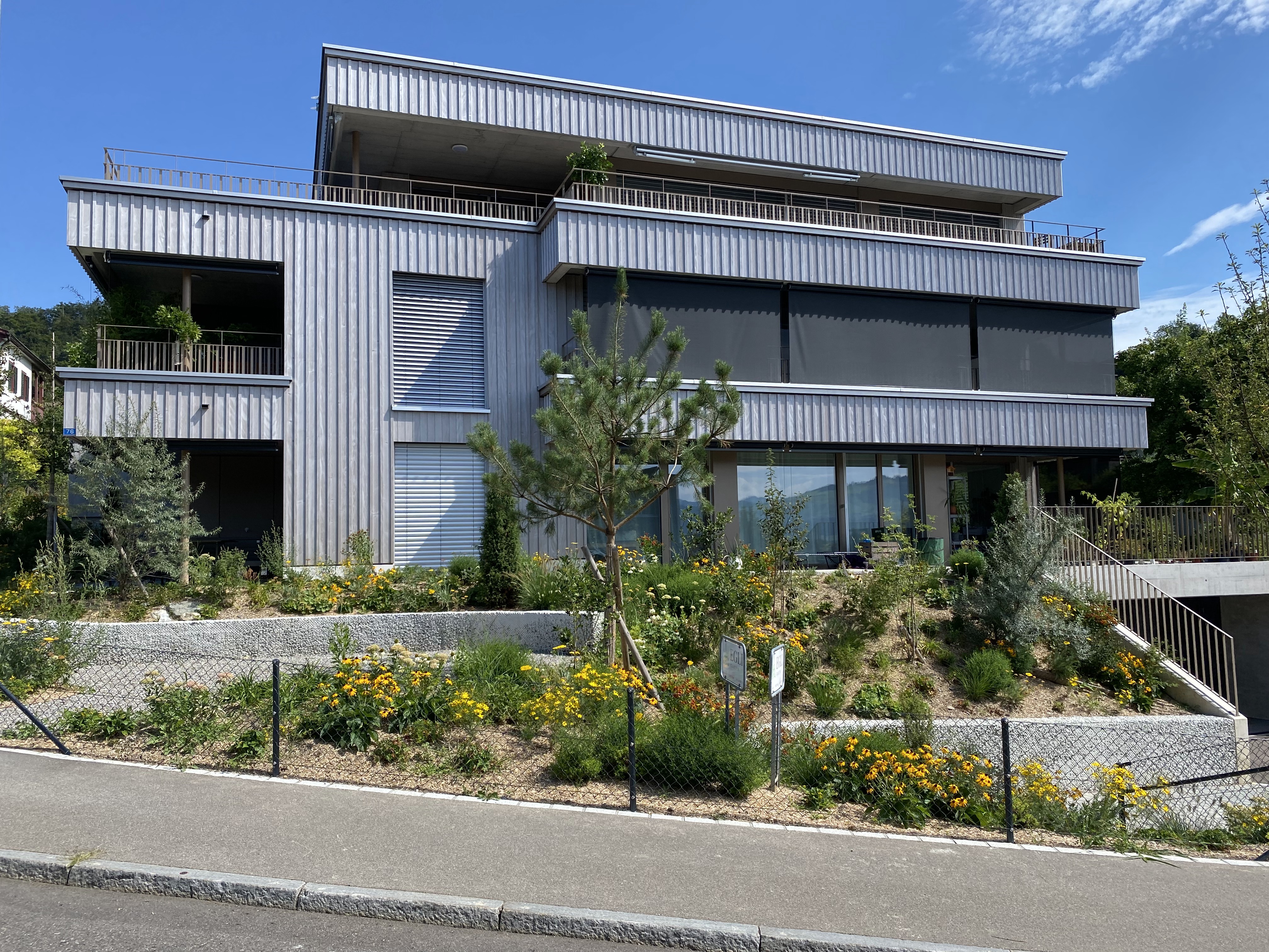 Ein neues Mehrfamilien Haus in Stäfa mit einer Holzfassade.